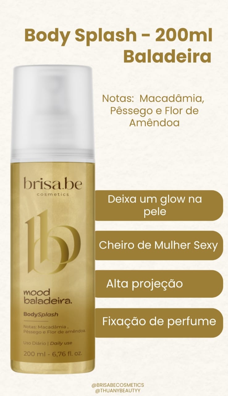 Cheiro de mulher poderosa e pronta pra brilhar! O Baladeira tem uma fragrância marcante, com macadâmia, pêssego e flor de amêndoa. É aquele cheirinho que grita presença e faz todo mundo perguntar “que perfume é esse?” Fixação top, glow radiante e muita atitude em cada borrifada!